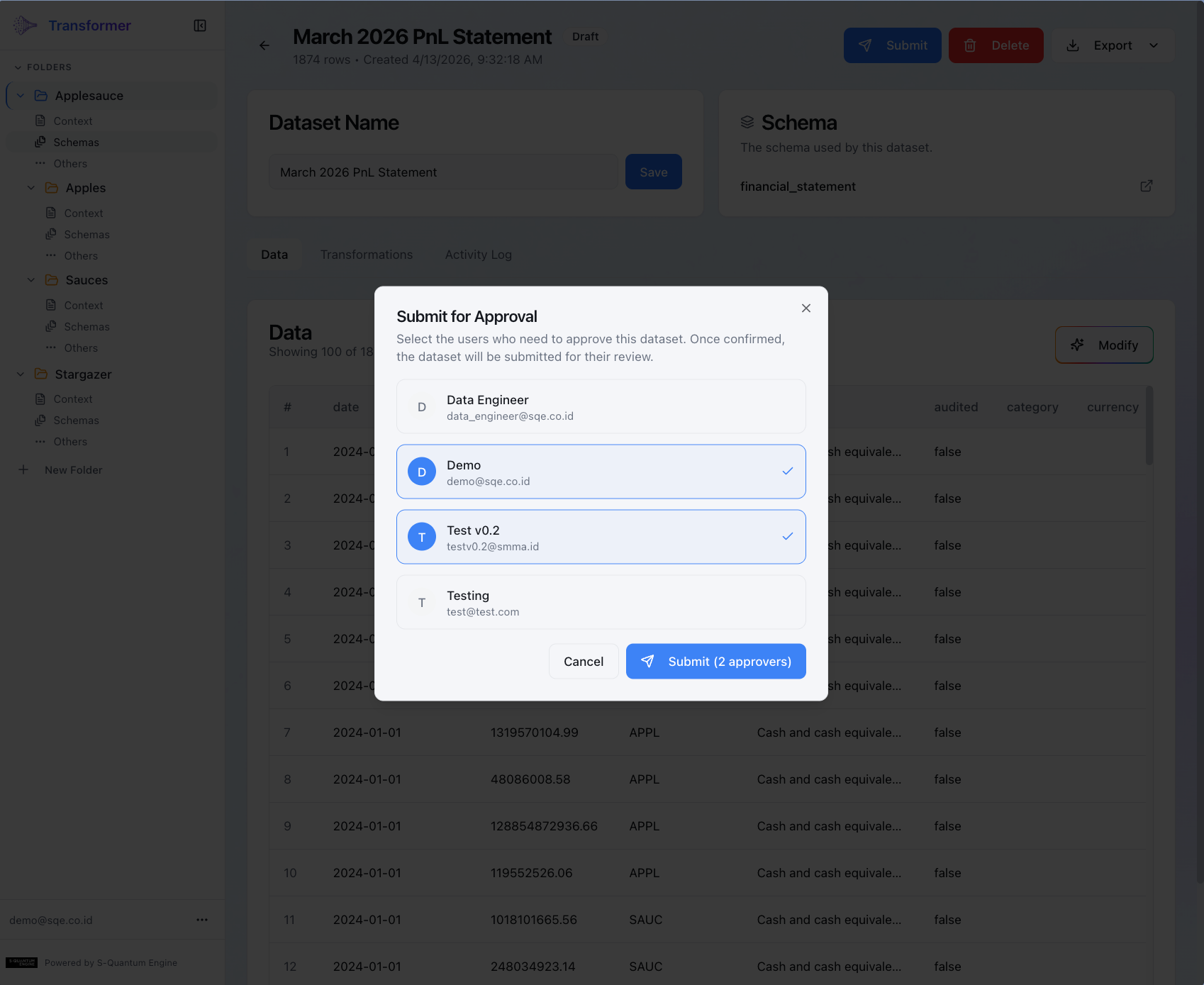 Approve and review transformed data through a structured approval flow before merging into the final dataset.